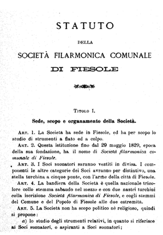 Con l’unificazione del Paese, il nuovo Stato doveva costruire e diffondere una serie di simboli nei quali tutto il popolo potesse riconoscere la sovranità nazionale. S’impose così una ritualità pubblica capace di ricordare i momenti, i personaggi e gli eventi fondanti dell’Italia democratica: una ritualità civile celebrata all’aperto, in piazze e giardini, cui era necessaria proprio la sonante musica delle bande. Come molte filarmoniche toscane, anche quella Fiesolana nasce dall’esigenza della comunità locale di creare un corpo musicale stabile per accompagnare la ritualità pubblica.