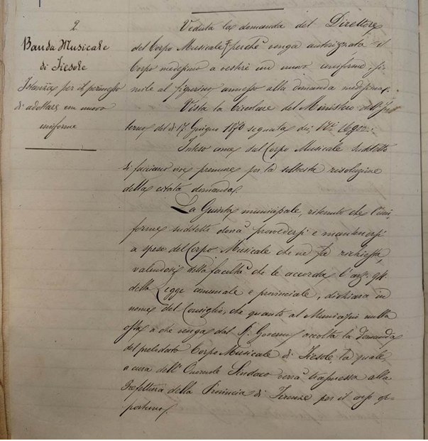 3 marzo 1876, Banda musicale di Fiesole. Istanza per il permesso di adottare una nuova uniforme. ACF Postunitario, Deliberazioni della Giunta Municipale, II 10c. 33v del 2.